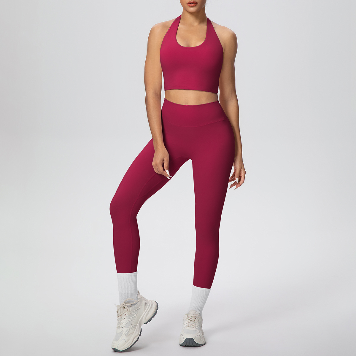 Sujetador deportivo de dos piezas con espalda descubierta y escote halter de color liso para correr, modelar el cuerpo, pantalones de entrenamiento y yoga