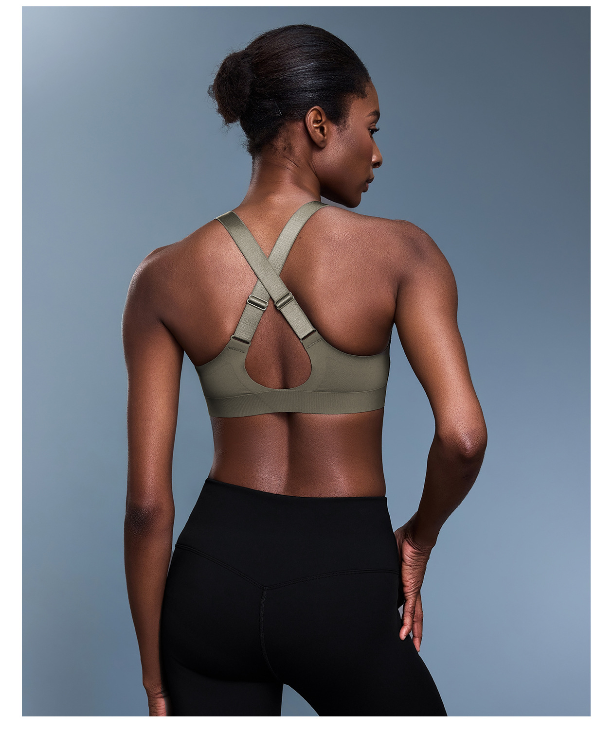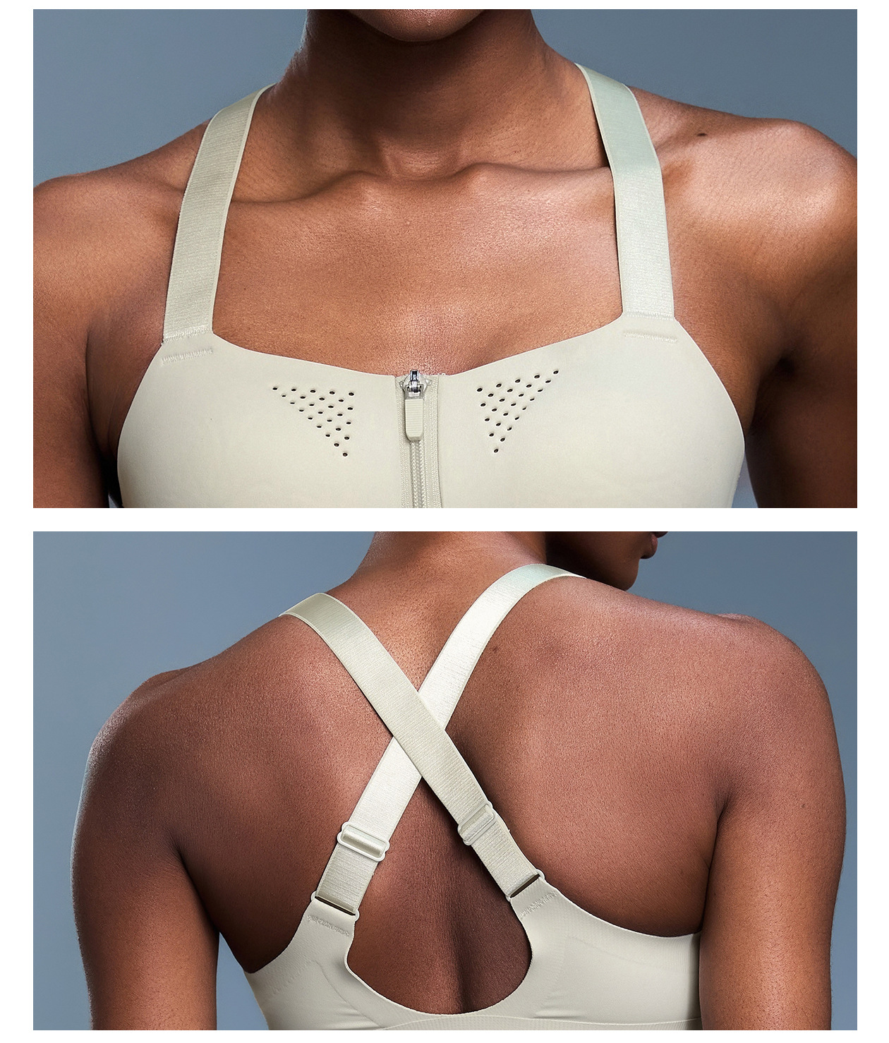 Soutien-gorge de sport une pièce à fermeture éclair sur le devant, bonnets antichoc, bretelles réglables, dos nageur, anti-affaissement
