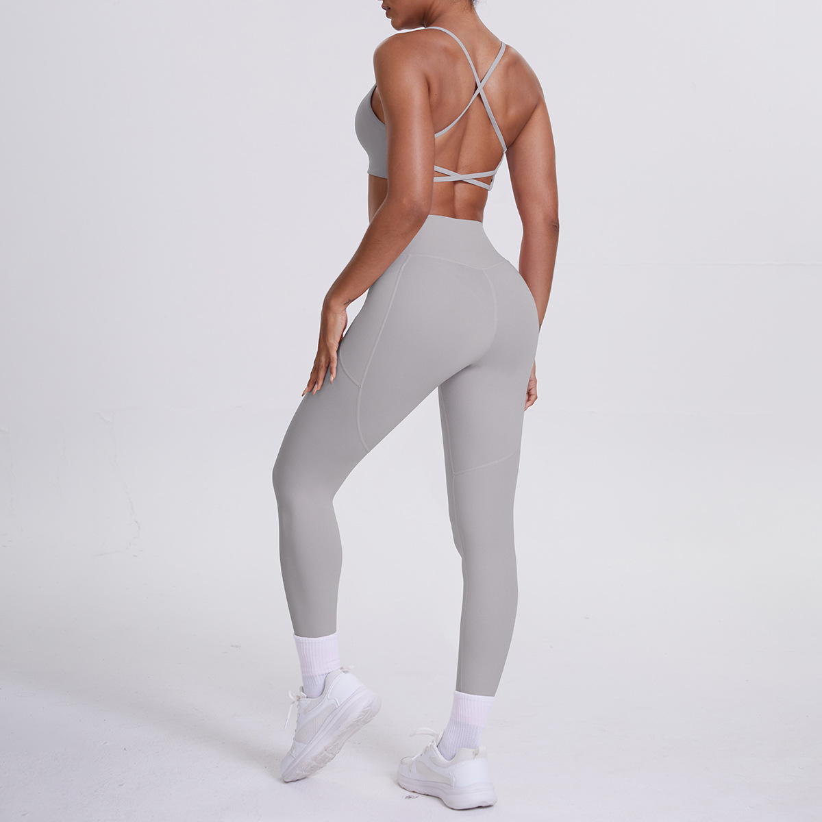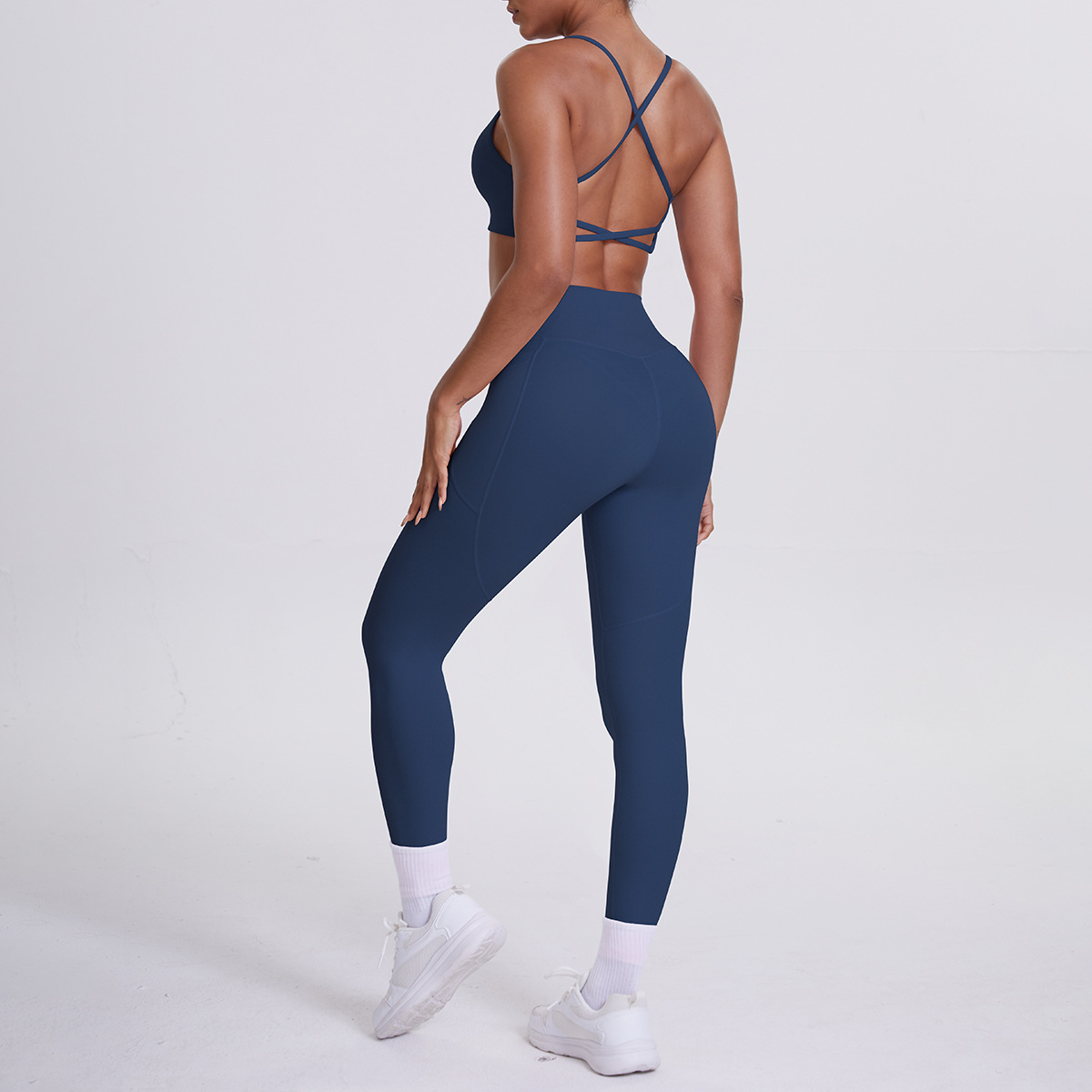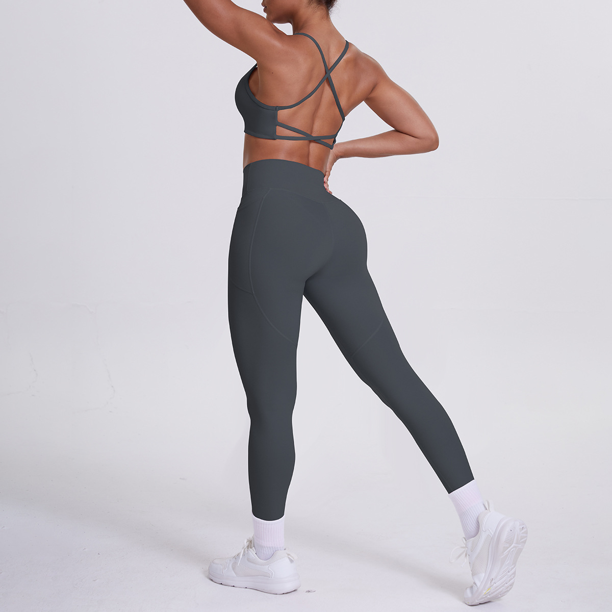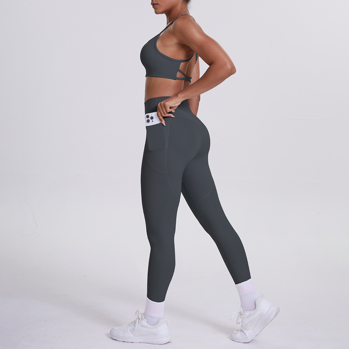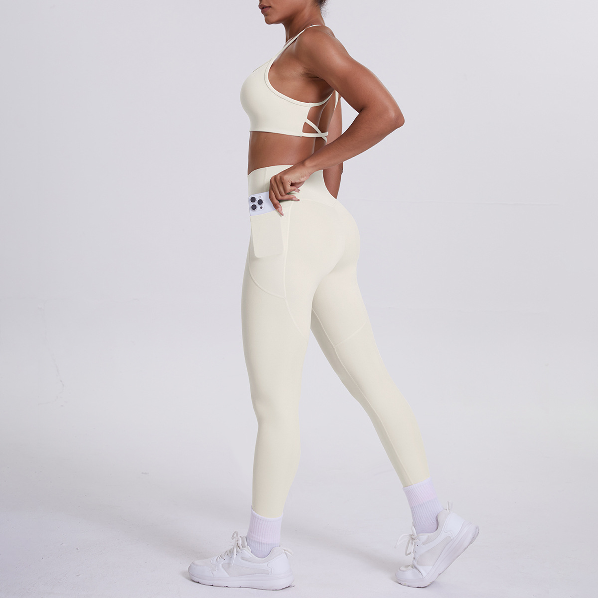 Pantalon de sport effet seconde peau, poches, dos nu galbant, idéal pour la course, le fitness et le yoga.