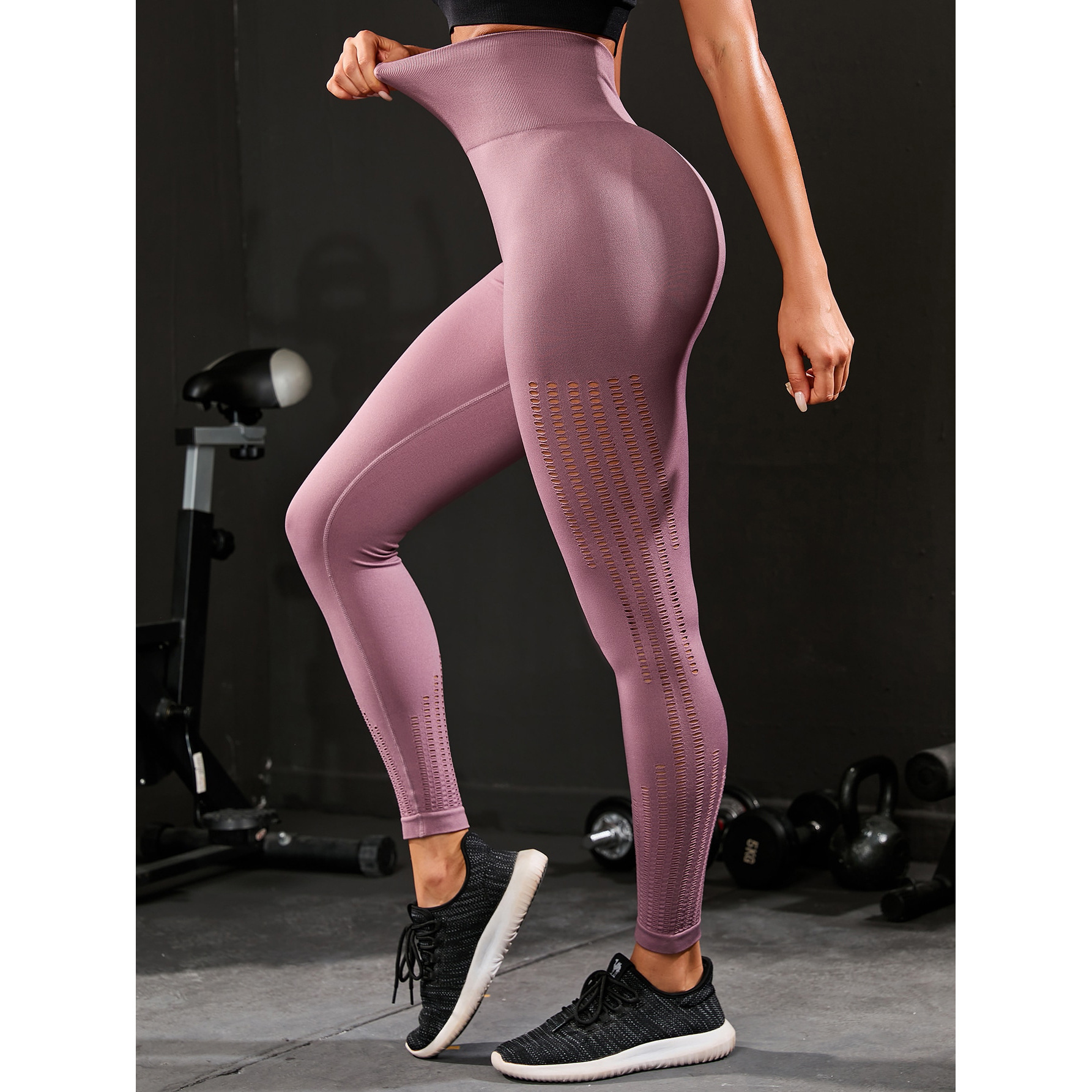 Pantalon de yoga de sport en maille sans coutures, taille haute, respirant, coupe pêche, séchage rapide.