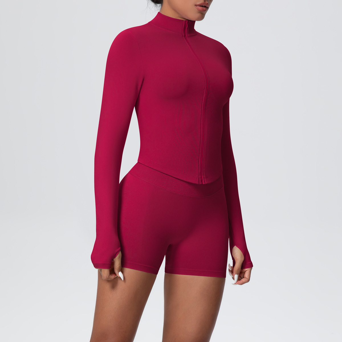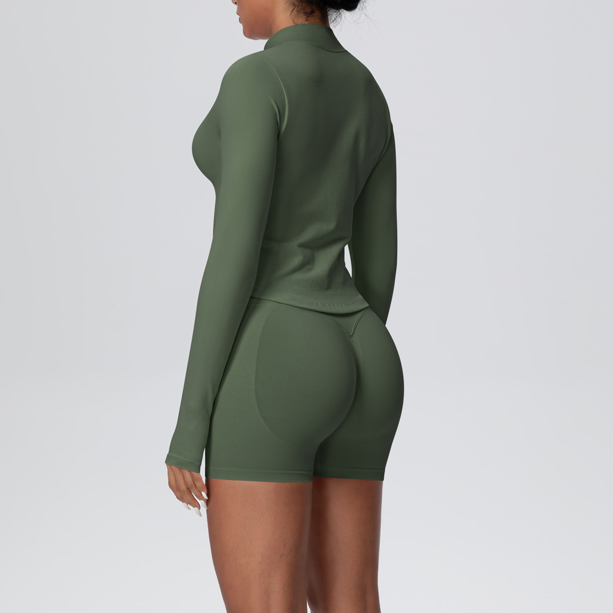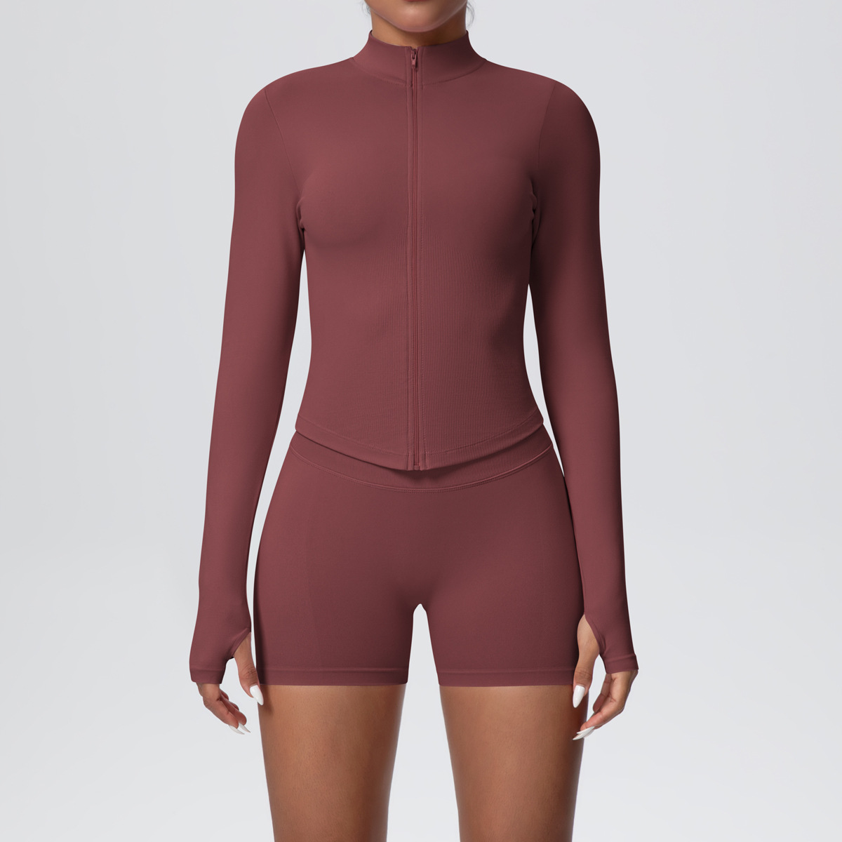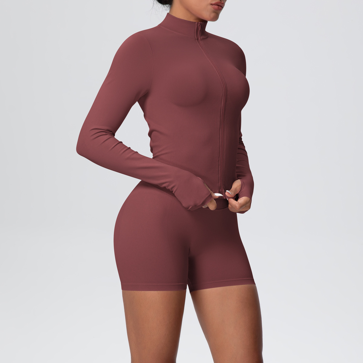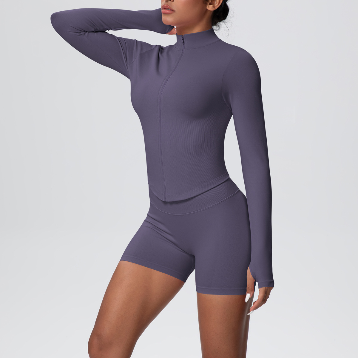 Ensemble de yoga pour femme : veste de yoga moulante à col montant, manches longues et fermeture éclair, short de yoga moulant à séchage rapide et col montant, idéal pour le fitness et le yoga.