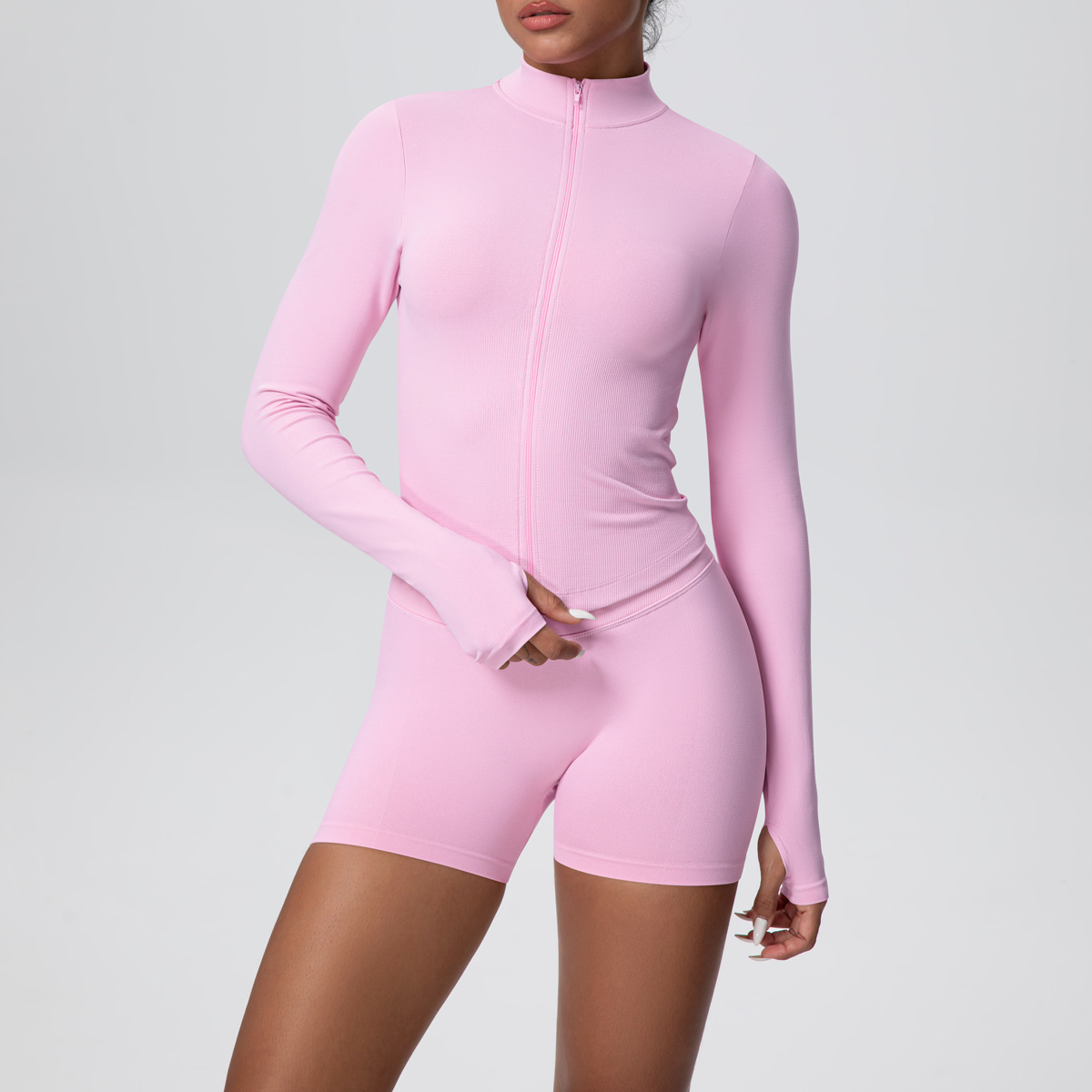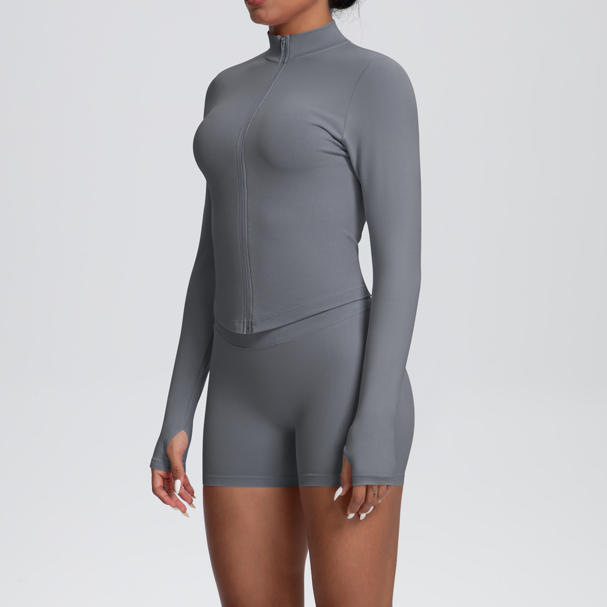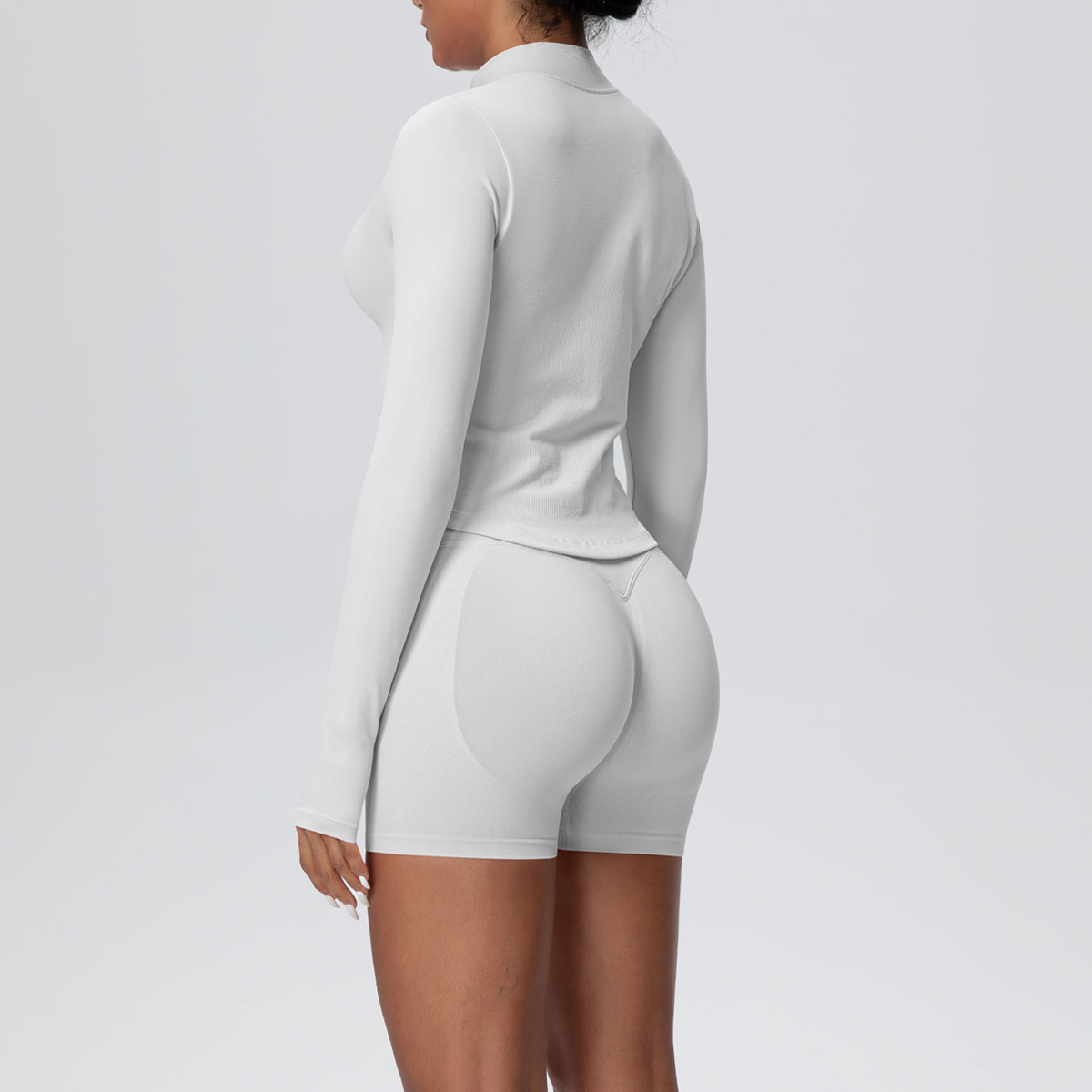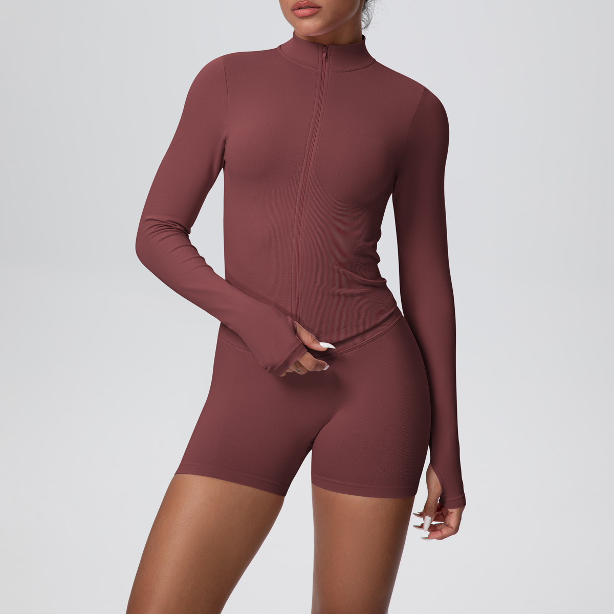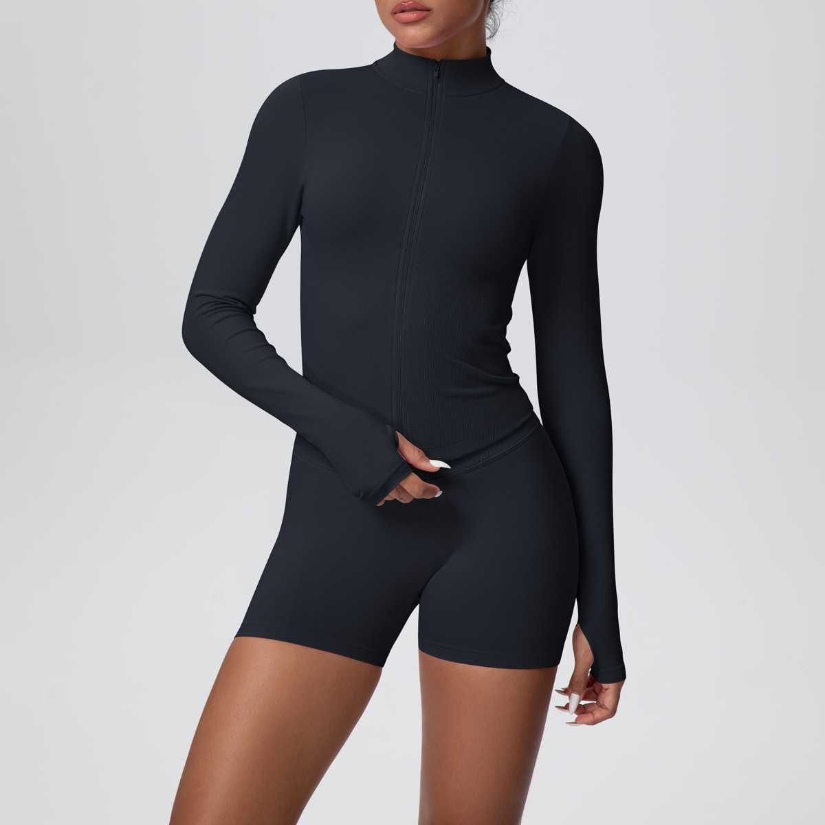 Ensemble de yoga pour femme : veste de yoga moulante à col montant, manches longues et fermeture éclair, short de yoga moulant à séchage rapide et col montant, idéal pour le fitness et le yoga.