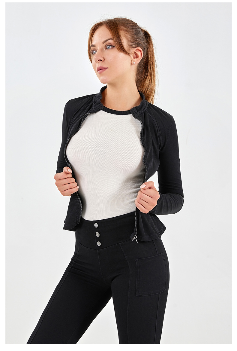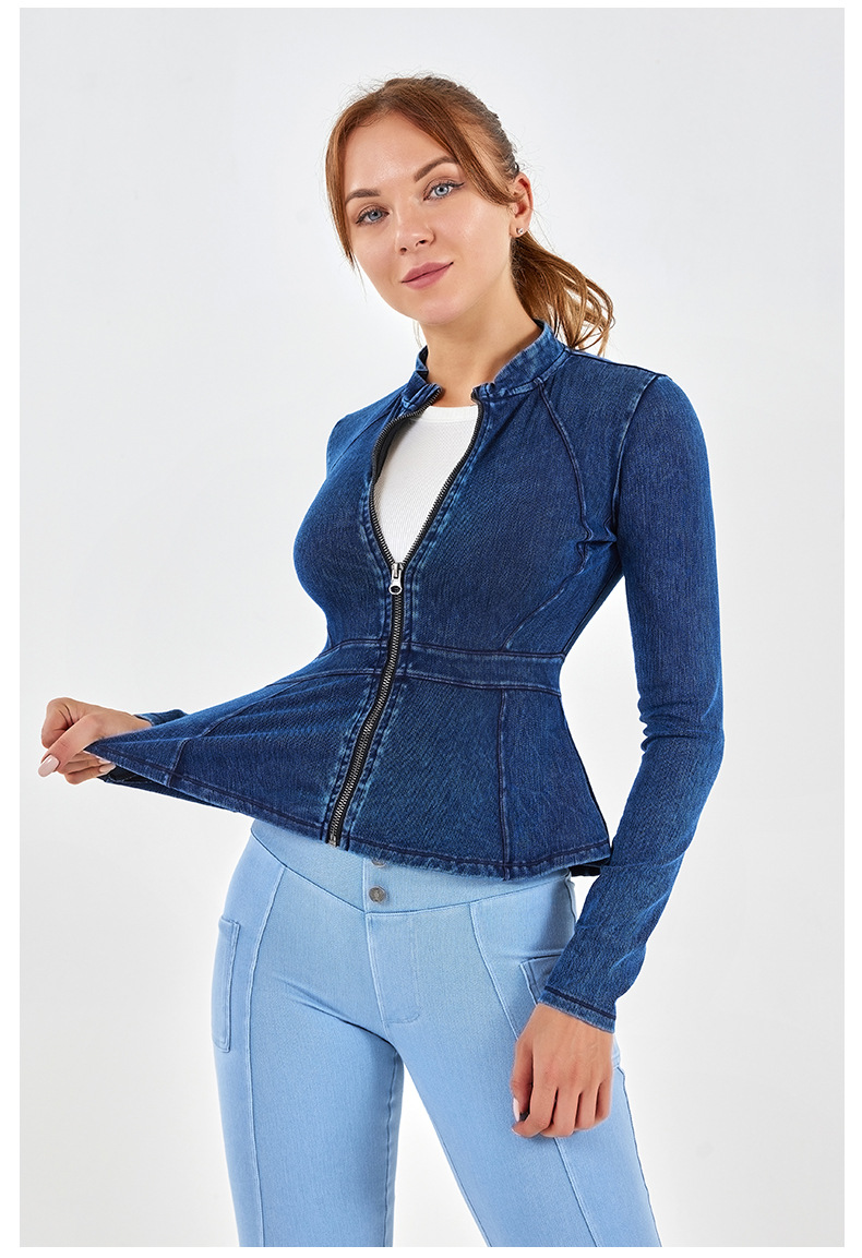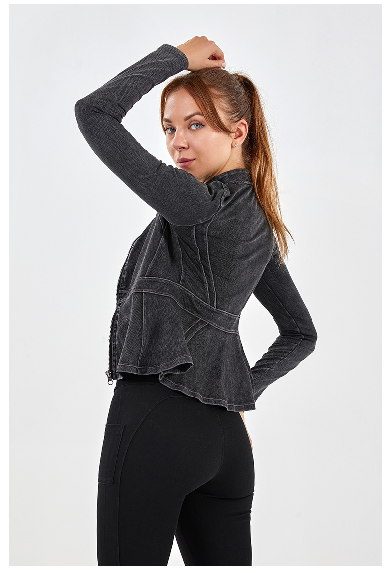 Autumn Winter Denim Yoga Zipper Coat High Collar Slimming A Line Hem Sports Outerwear Fitness Long Sleeved Upper Garment
