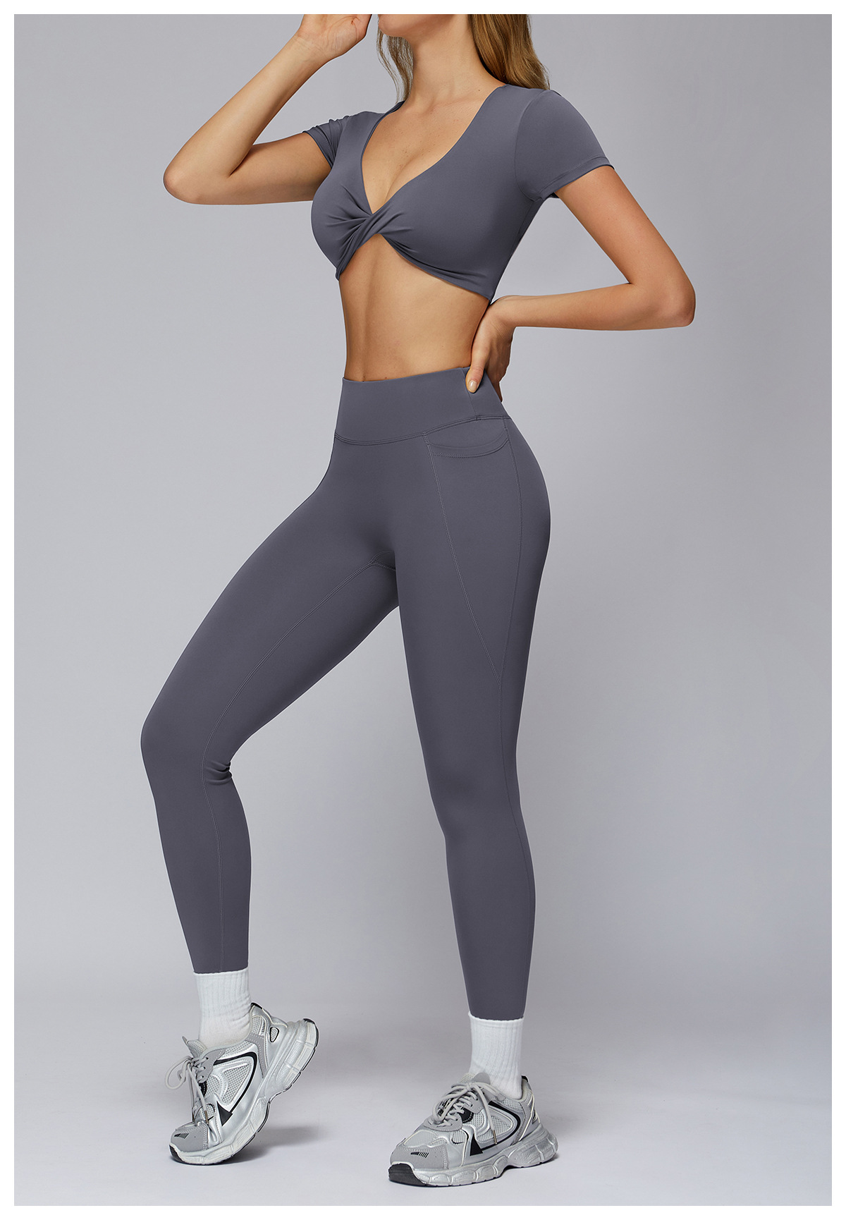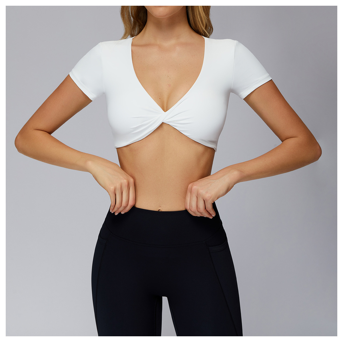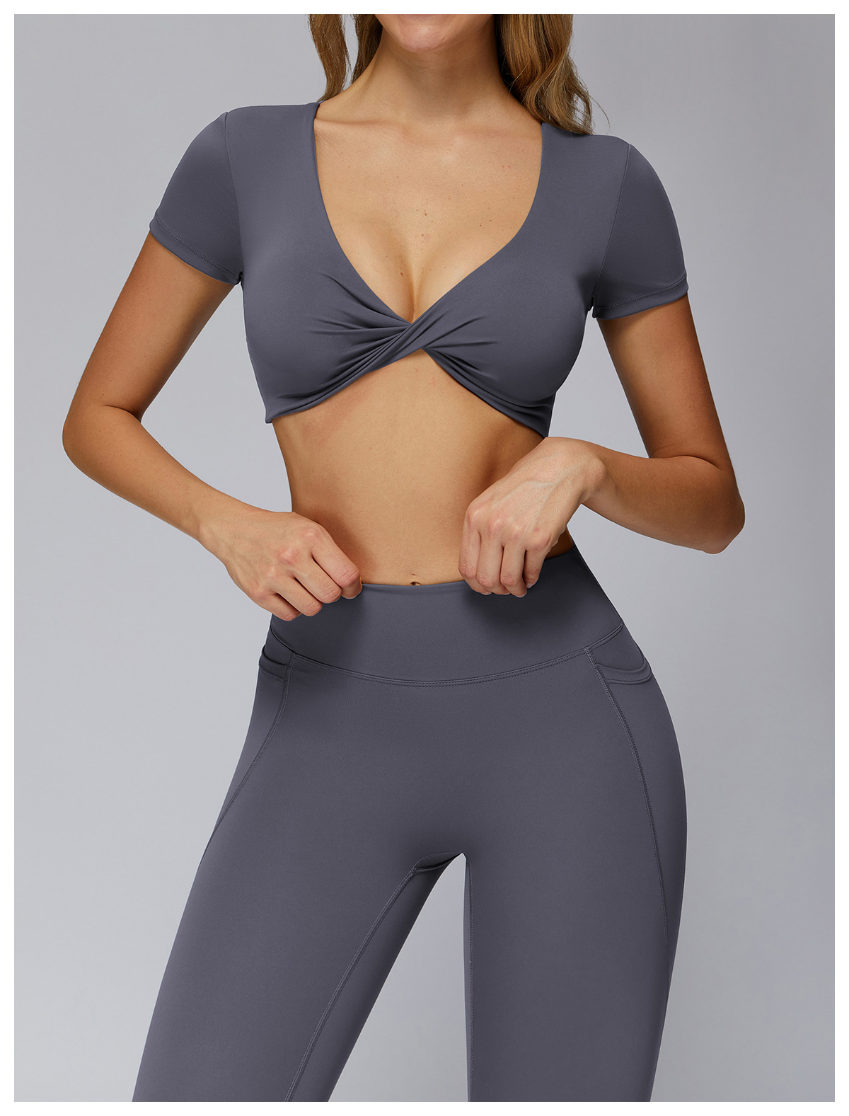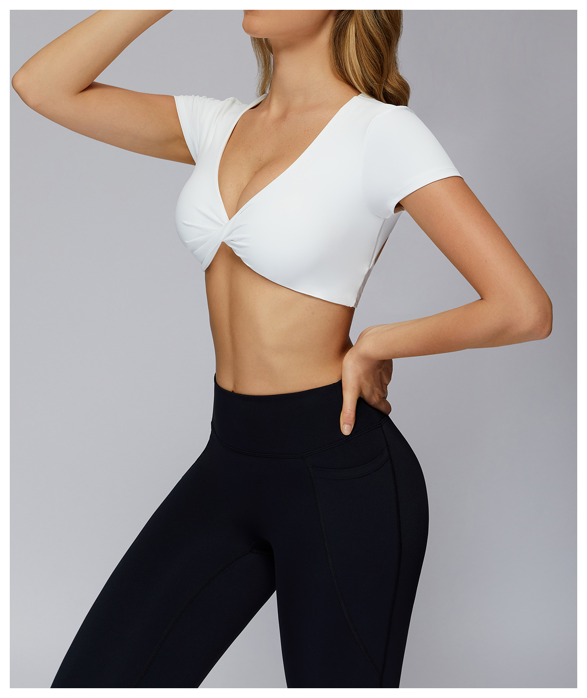 Nude Feel Pleated Yoga Short Sleeve V neck Hollow Out Cutout Beauty Back Tight Top Running Sports Fitness T shirt Women