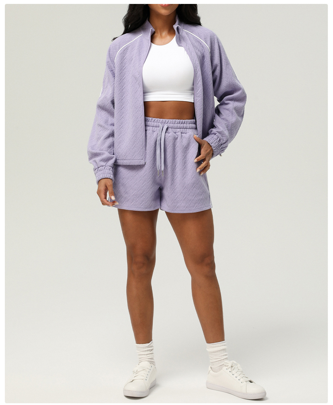 Texture Sports Long Sleeve Coat Shorts Casual Women Yoga Wear Two Piece Sets
