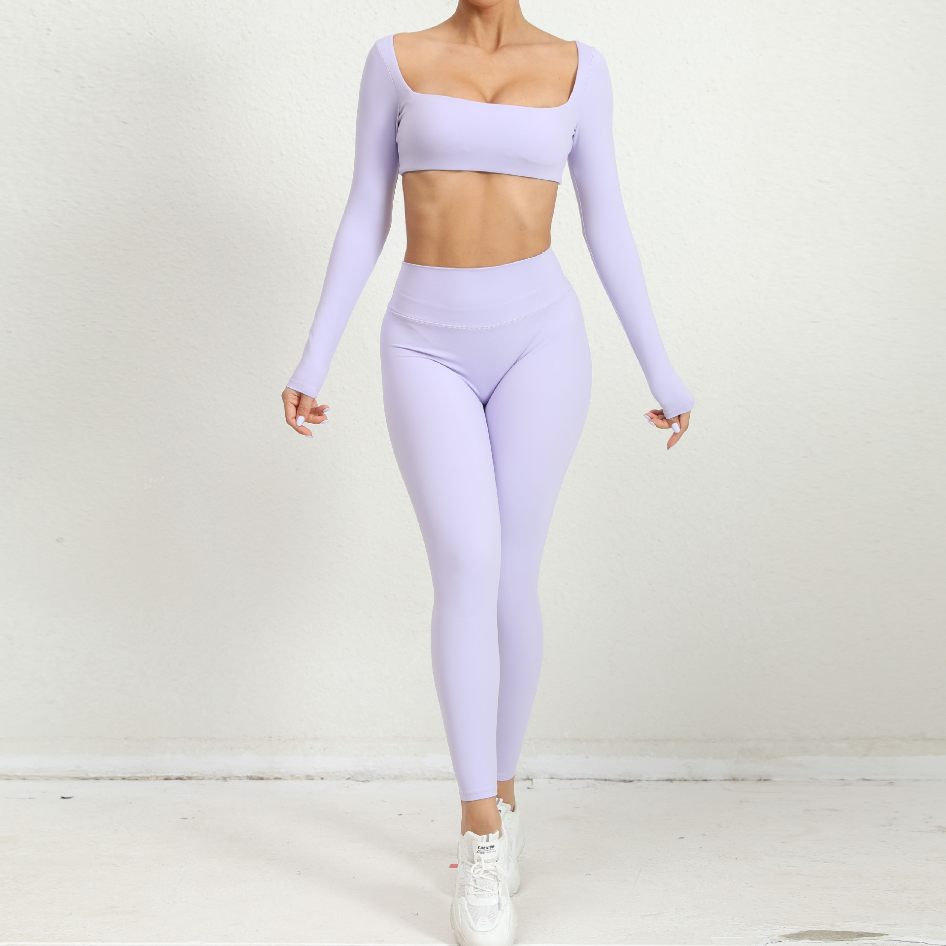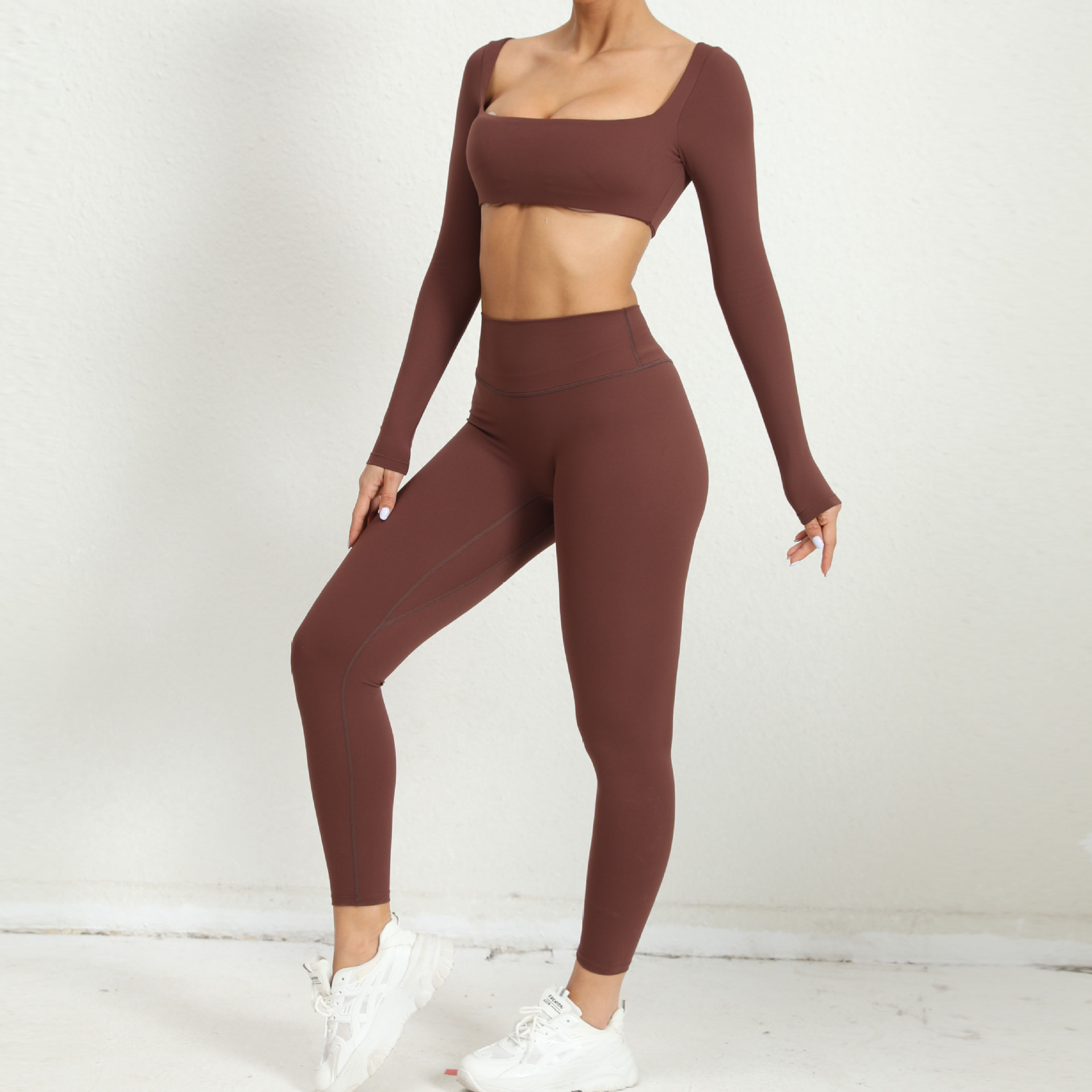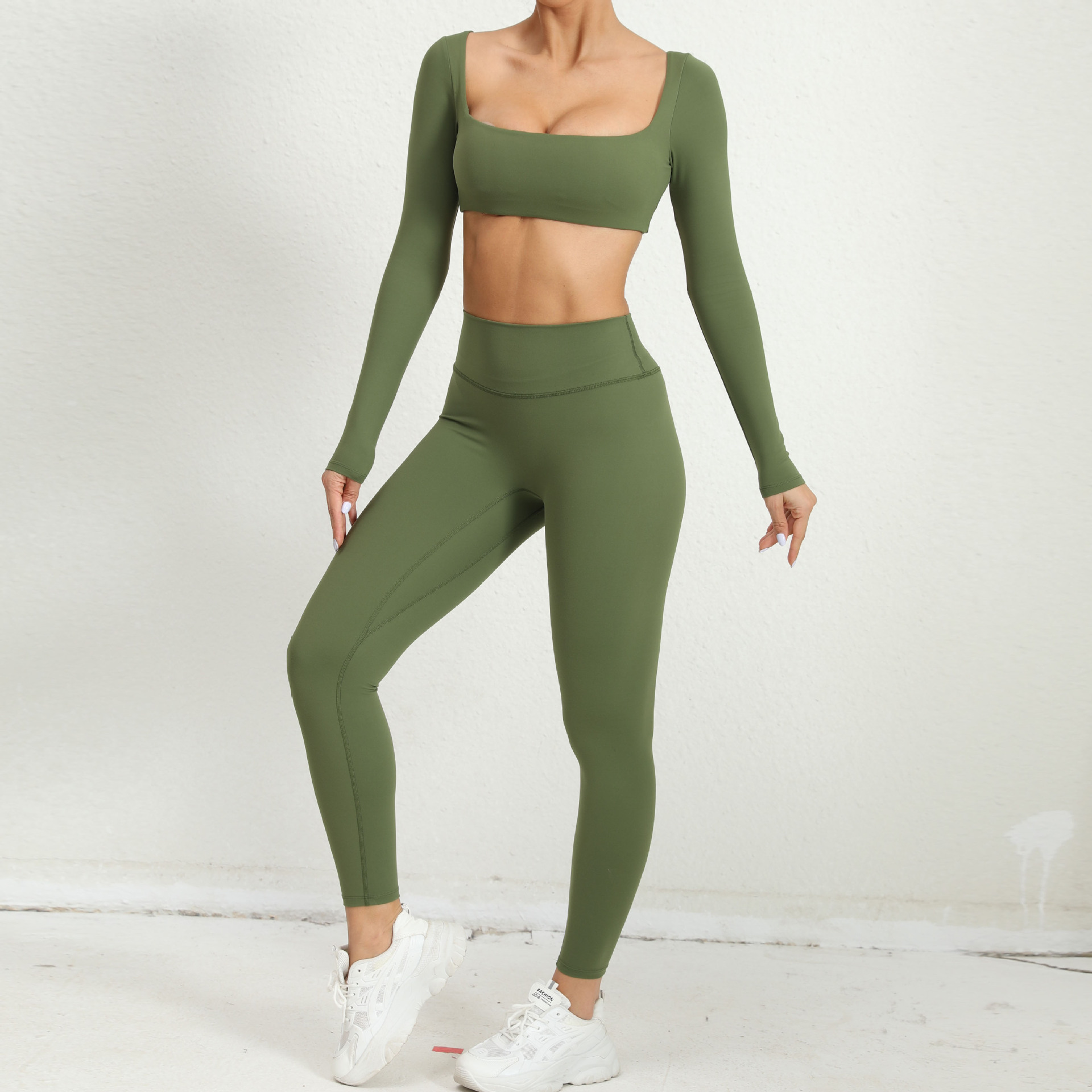 Winter Nude Feel Tight Square Collar Yoga Clothes Suit Outdoor Running Quick Drying Sports Long Sleeve Fitness Two Piece Suit
